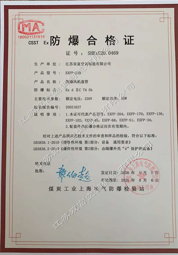 防爆風機盤管和防爆軸流風機的防爆合格證 江蘇雙富空調制造有限公司